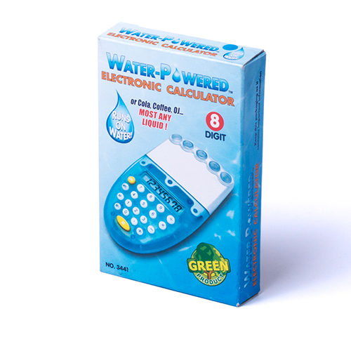 Calculadora ecológica de 8 dígitos en original diseño bicolor y funcionamiento con agua. Teclas de suave acabado, dosificador incluido y presentada en caja individual.