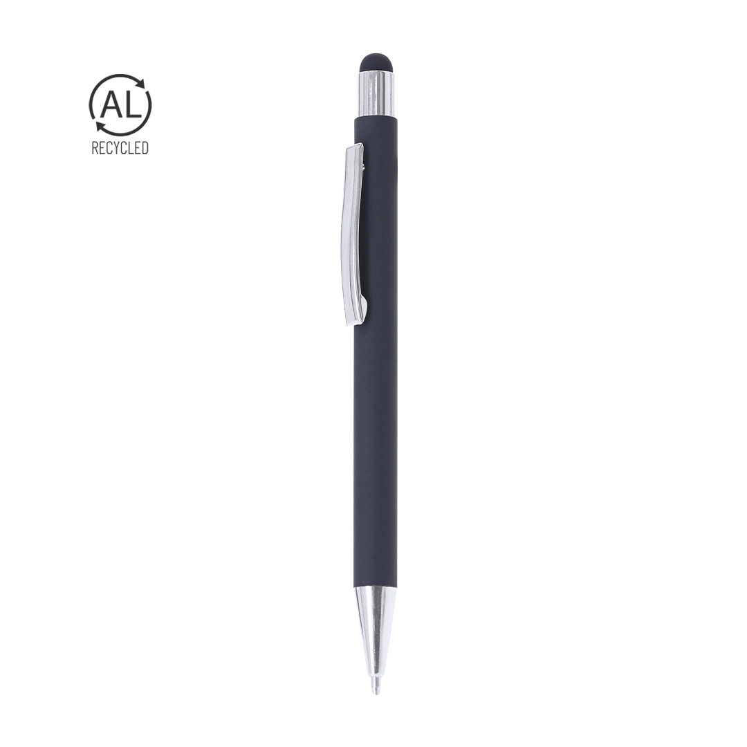 Bolígrafo puntero de mecanismo pulsador fabricado en aluminio reciclado. Pulsador y clip metálico en acabado cromado, acabado en puntero a juego. Cuerpo terminación en goma, especialmente diseñado para marcaje en láser. Distintivo aluminio reciclado en la parte superior del bolígrafo. De cartucho jumbo y en tinta azul. El aluminio reciclado es un material con posibilidades de reciclaje casi infinitas, sin perder sus propiedades originales y consumiendo menos energía en este proceso.Certificación GRS (Global Recycled Standard / Estándar de Reciclaje Global), que garantiza el origen reciclado del material usado para fabricar el producto. Carga Jumbo