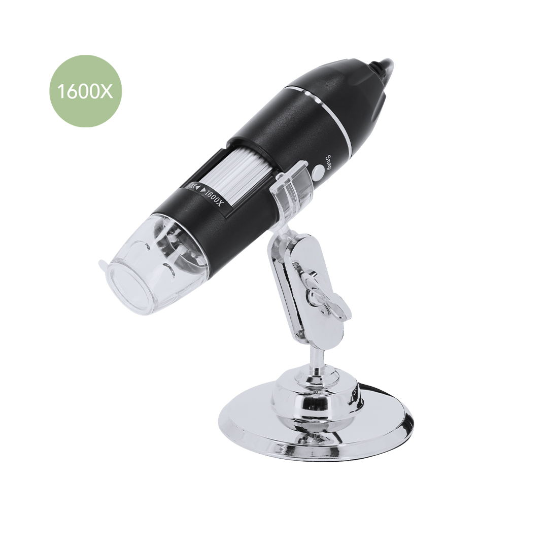 Microscopio digital compacto con aumento de 0-1600X. Luz LED ajustable y resolución personalizable hasta 1600x1200 de forma manual. Incluye soporte ajustable, cable de 140 cm con adaptador USB, Tipo C y Micro USB, para usar en diversos dispositivos. Diseño elegante en negro mate con detalles plateados, compatible con la app para Android. Dispone de regla de calibración y manual en español e inglés 8 Ledes. Conexión USB y Tipo C