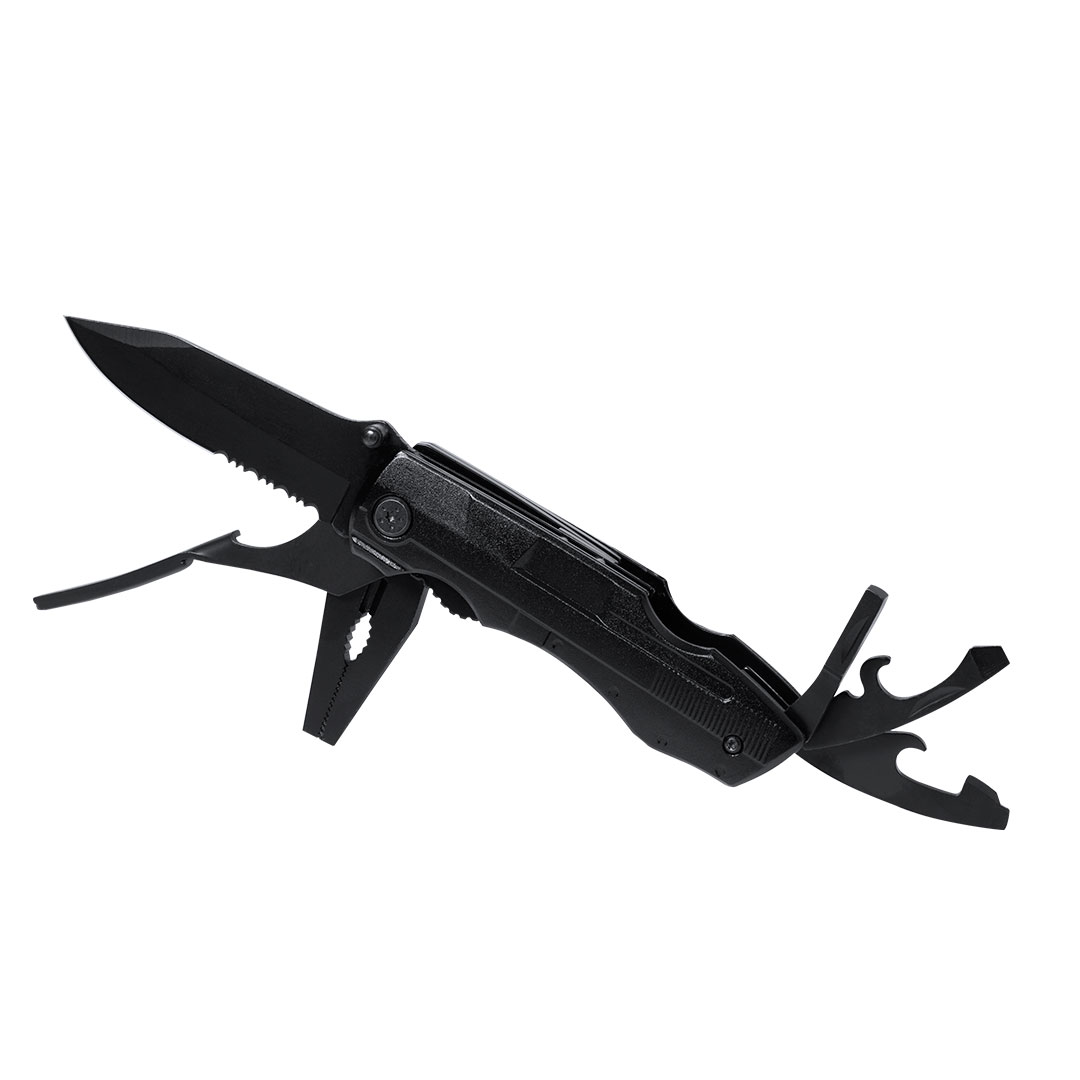 Navaja multiusos de acabado negro en acero inoxidable y resistente empuñadura a juego en aluminio. De diseño plegable y tamaño compacto. Incluye 10 funciones: - Destornillador con múltibles cabezales- Cuchillo de filo liso y dentado-Abrebotellas- Abrelatas- Alicates con cortador de hilosPresentada en práctico estuche de poliéster a juego con accesorio para cinturón. 10 Accesorios. 10 Funciones. Funda Poliéster